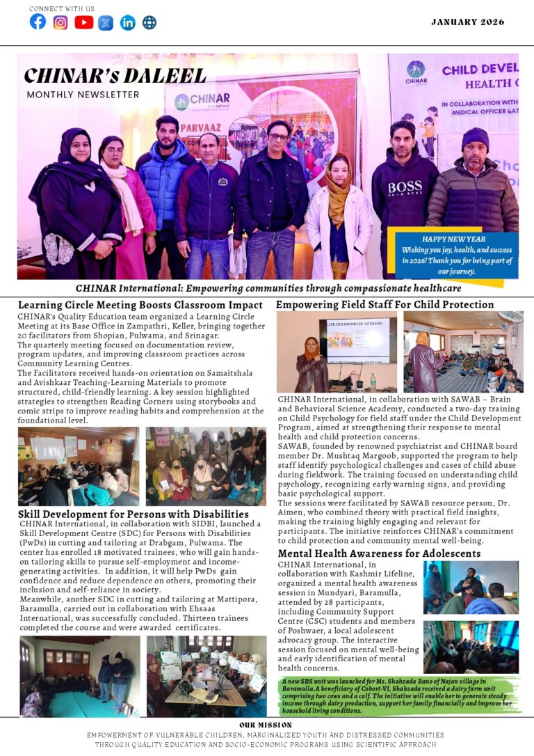 CHINAR held its first Art Mela for 78 enrolled children under Child Development in Budgam (33) and Srinagar (45). The event encouraged creativity and was graced by CHINAR Patron Ms. Ismet Shahmiri, Director Ms. Zeba Durrani, and Global Executive Director Mr. Irfan Shahmiri, who interacted with the children and distributed prizes.